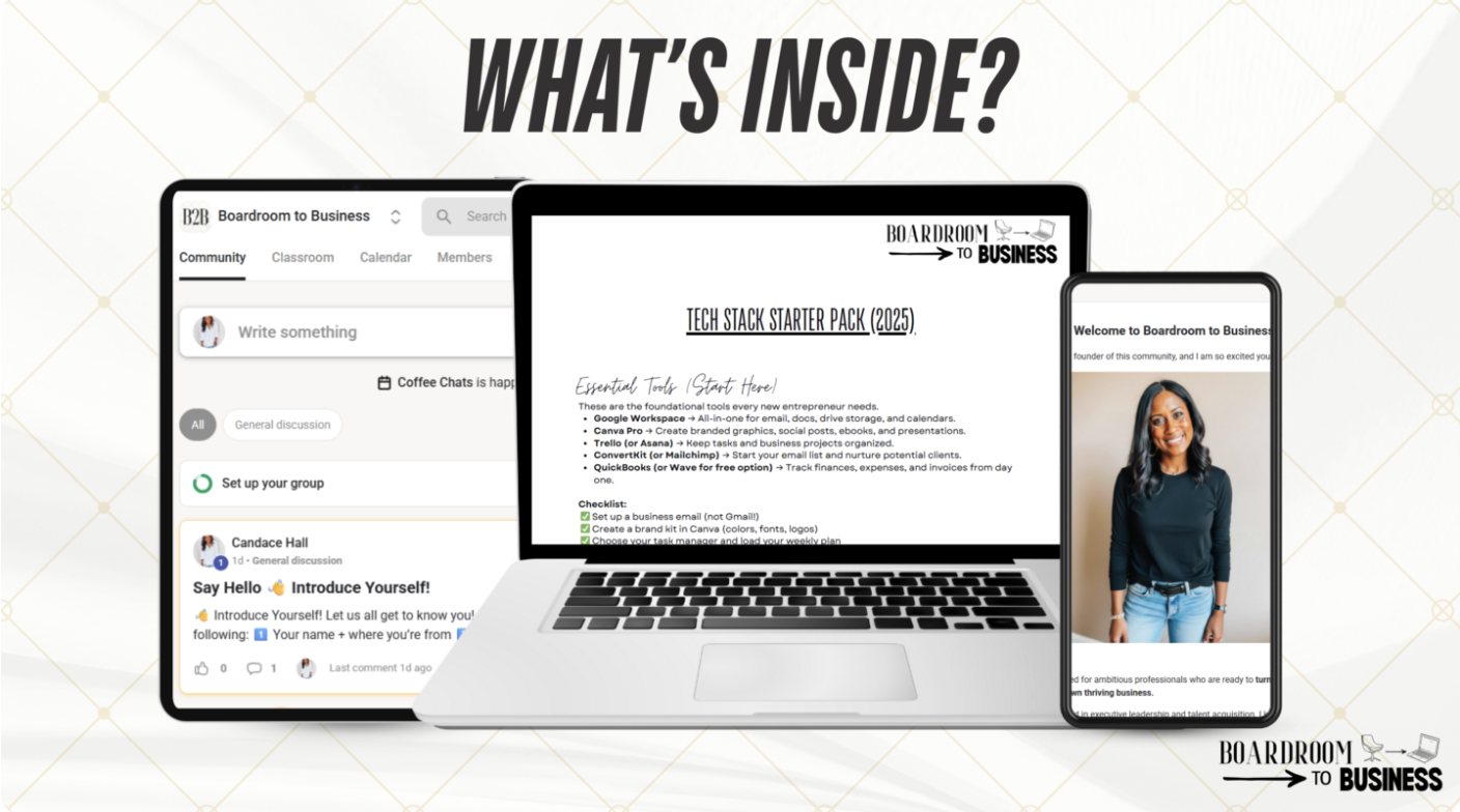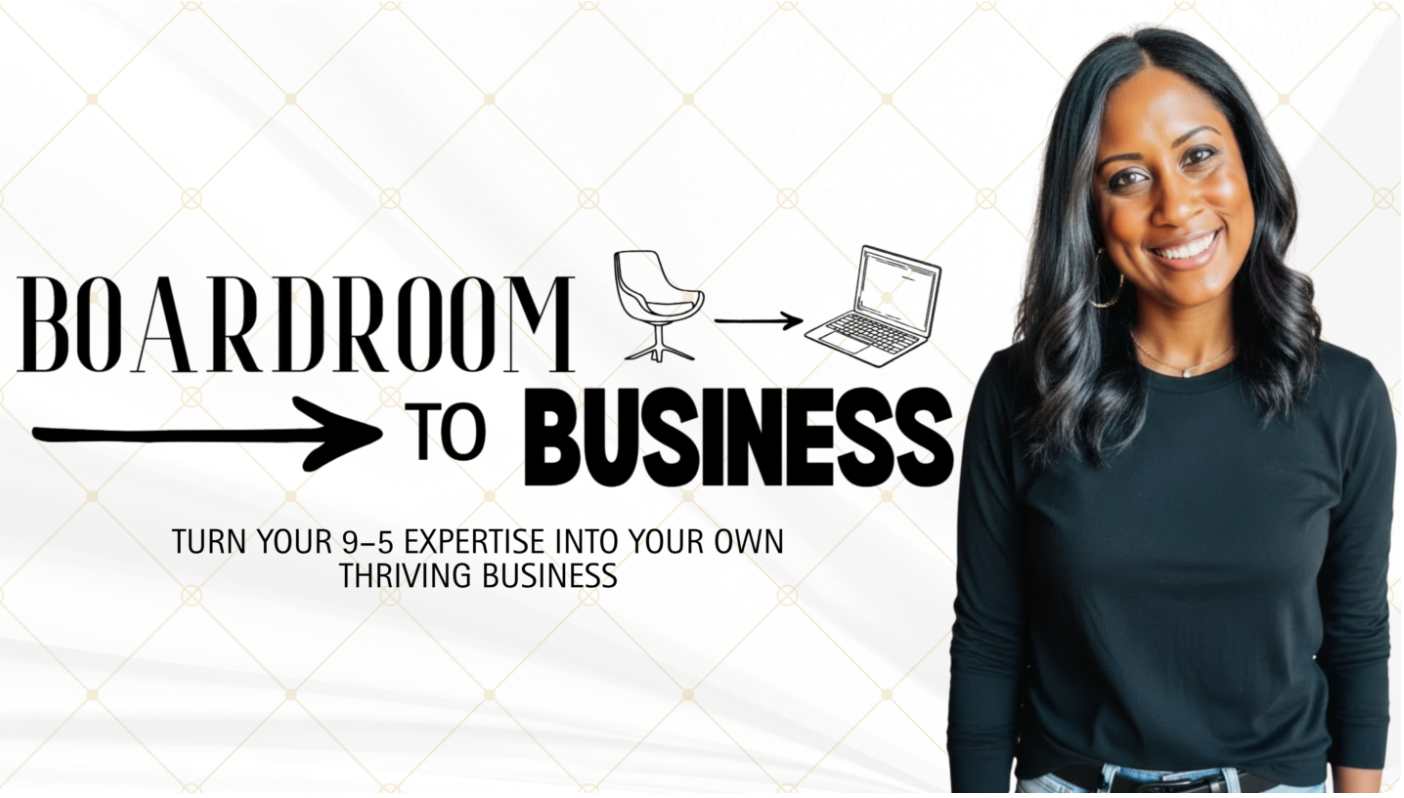 Boardroom to Business is a private community for professionals who are ready to take everything they’ve gained in the corporate world — the skills, the strategy, the experience — and turn it into a business that aligns with their purpose, lifestyle, and values.