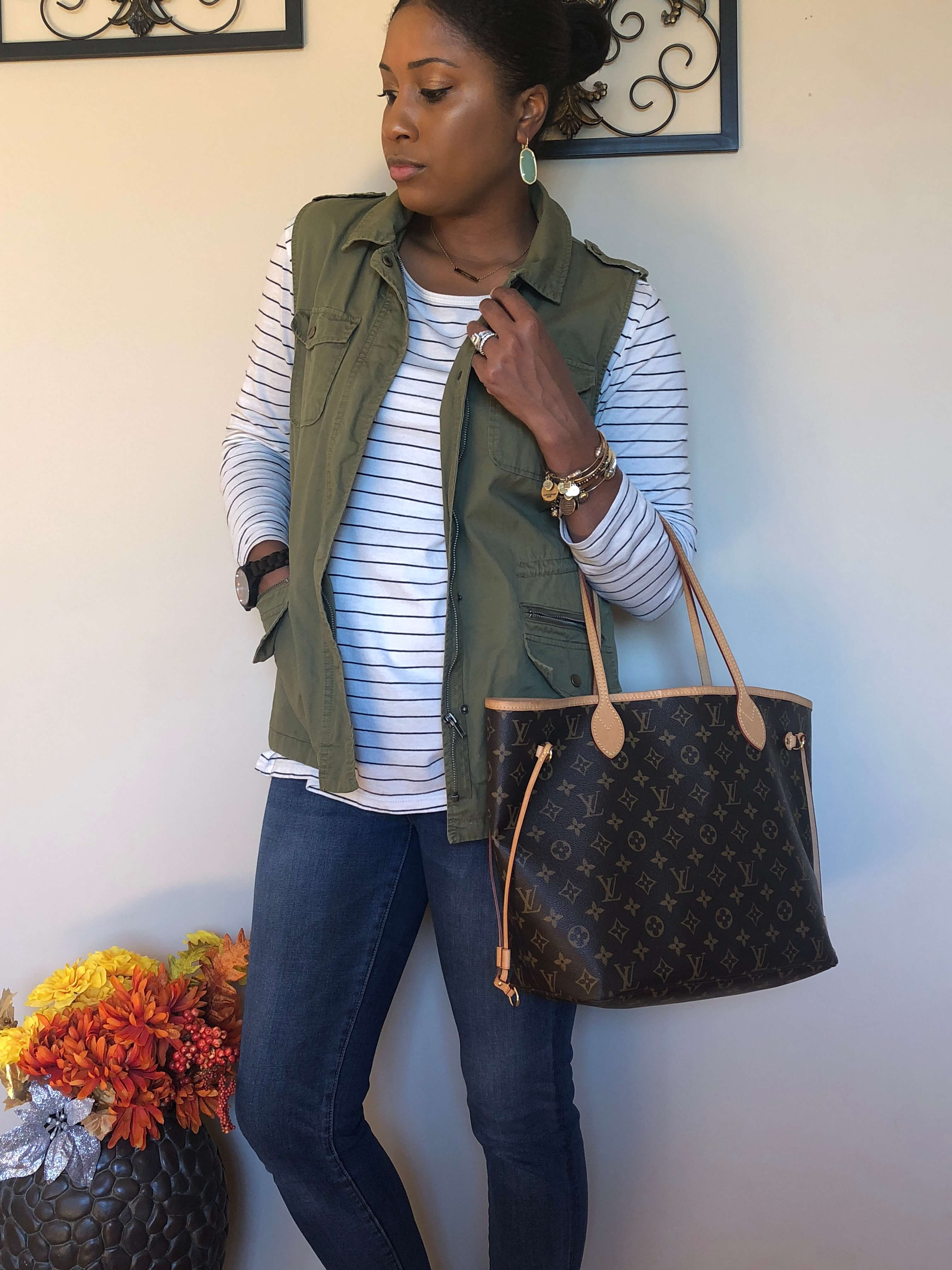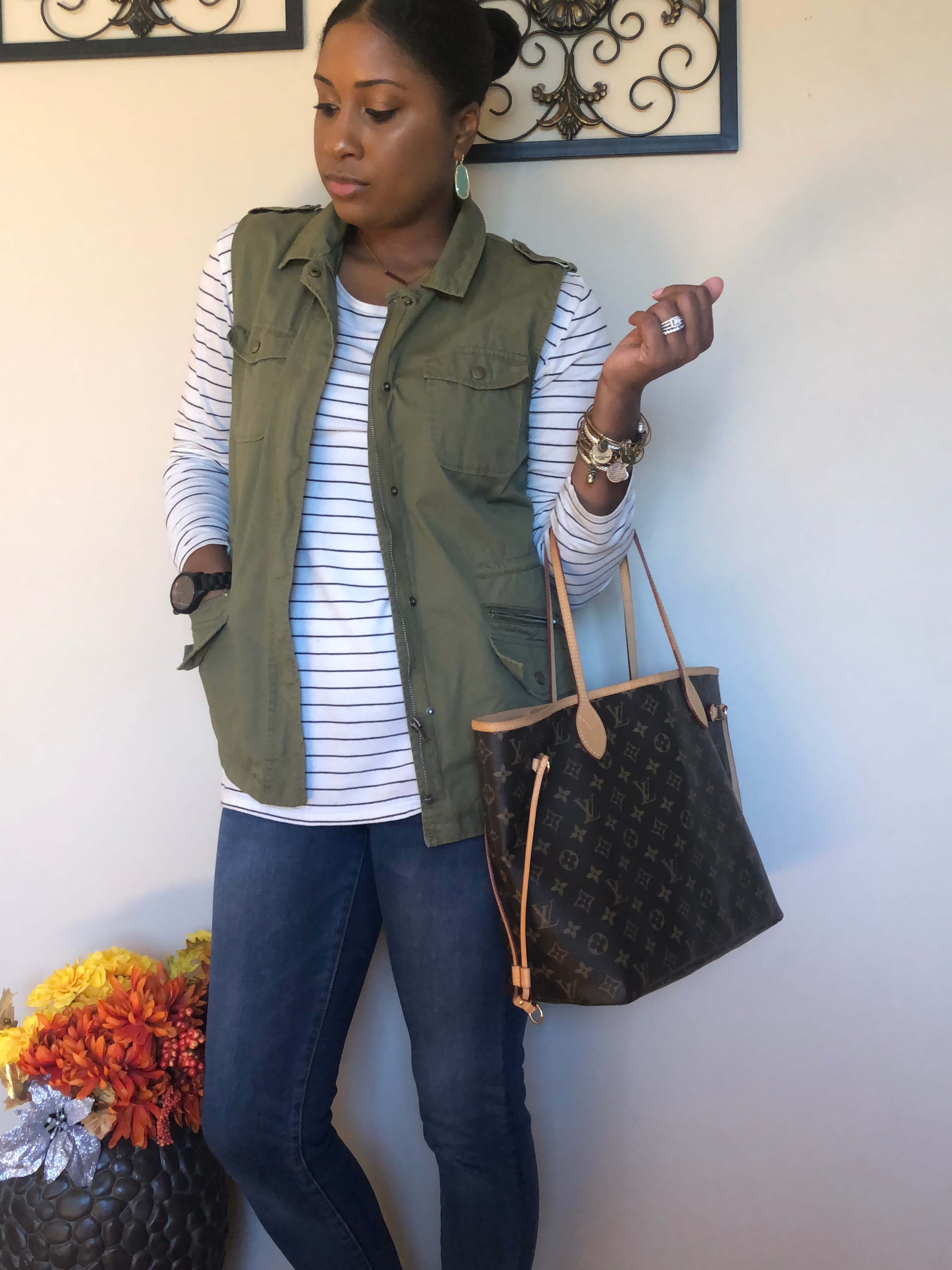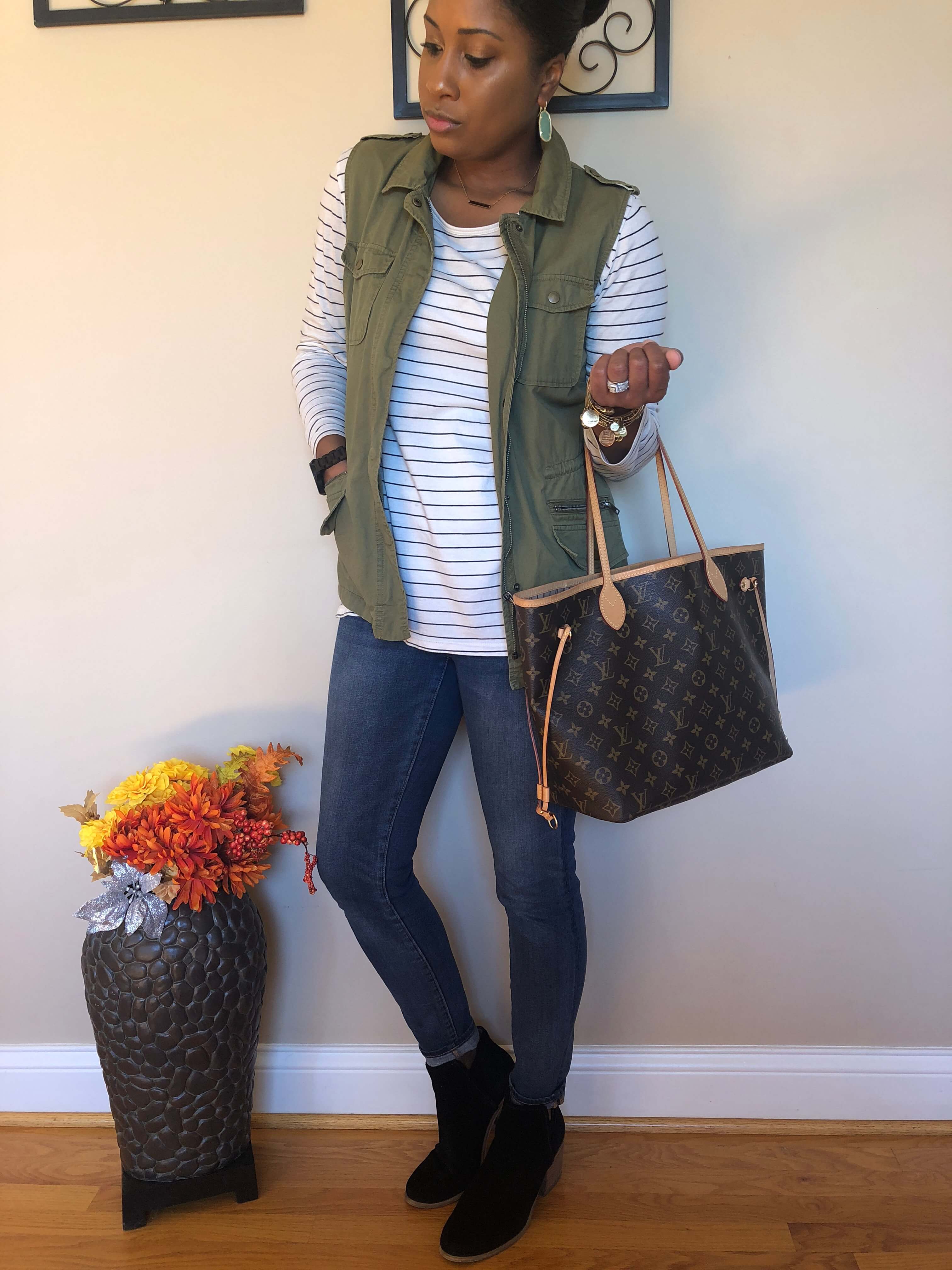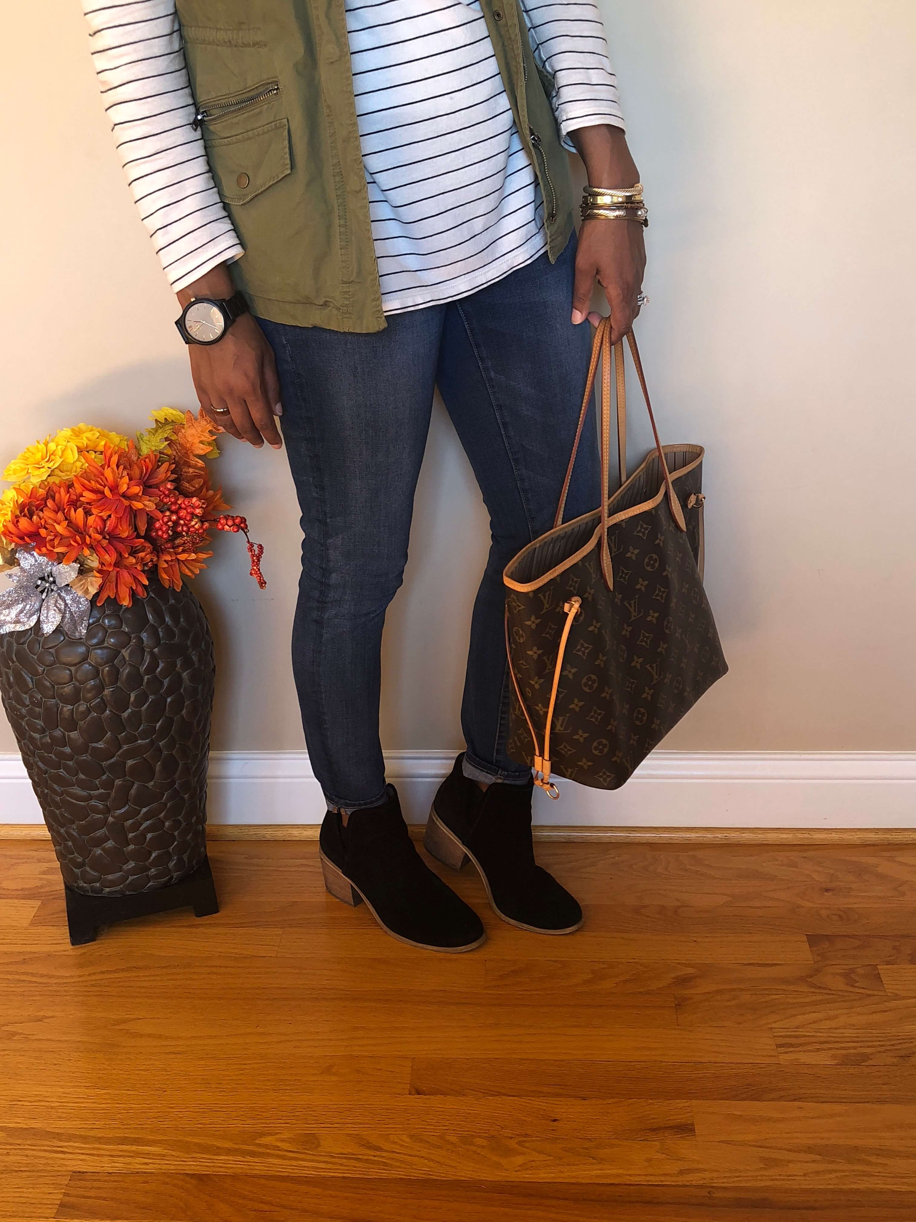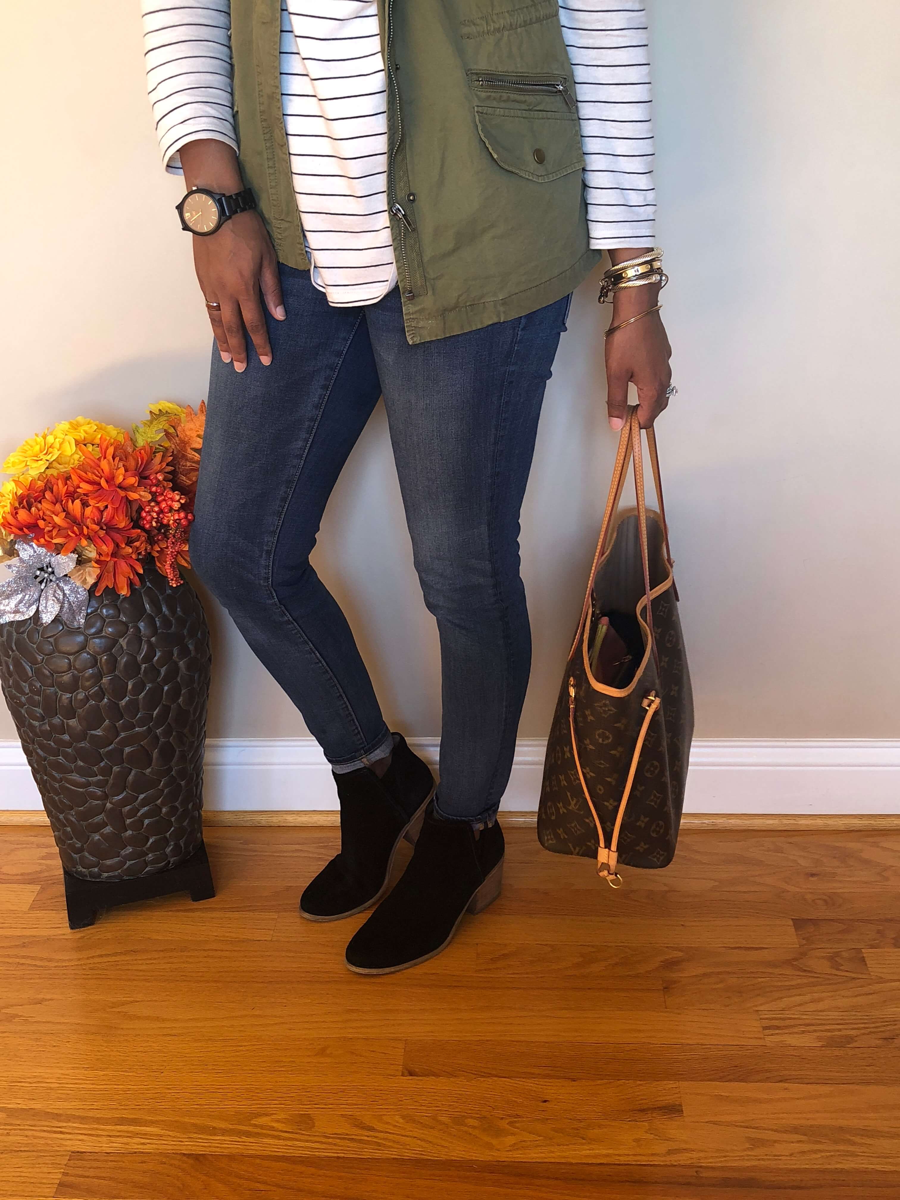 Last fall I shared that cargo vests, stripes and a couple other things were my favorite things to wear during the chilly brisk weather. Well, a year later, that hasn’t changed! There is just something about stripes, paired with a solid color vest and some block heel booties that just looks like a classic preppy look! Very “j-crew-ish!”